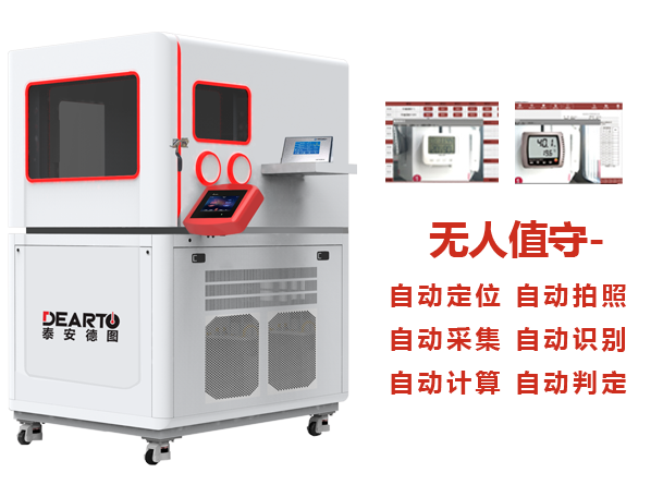 DTSL Pro-svr3 全自動溫濕度計檢定系統,是泰安德圖全新自主研發的全自動溫濕度計拍照識別檢定系統。系統由德圖全系列溫濕度檢定箱、精密露點儀、精密數字溫度計、拍照機器人和自動識別系統組成的全自動檢定裝置。系統支持自動定位、自動拍照、自動采集、自動識別、自動計算、自動判定,全自動完成整個檢定行程,無需人工干預。